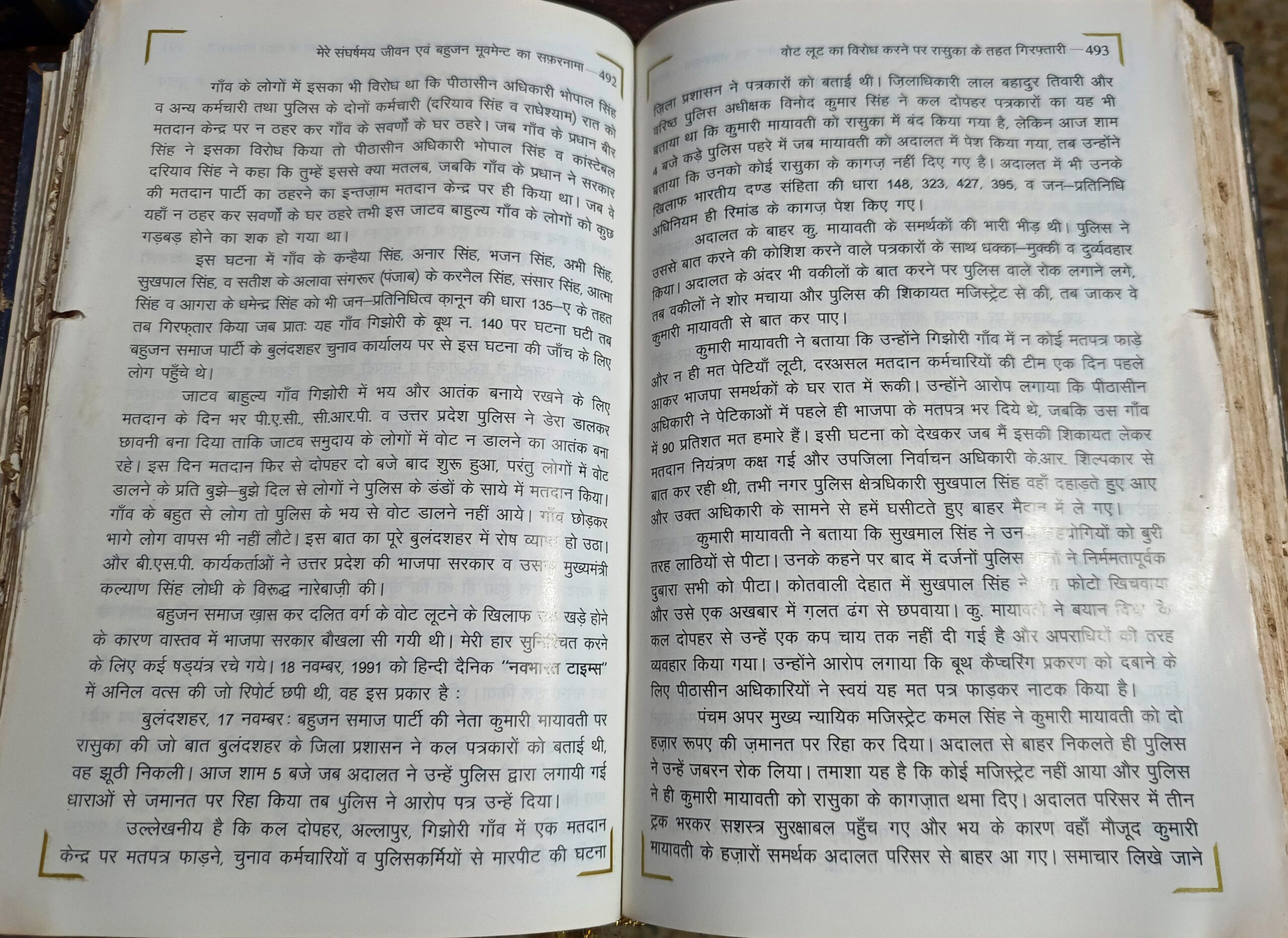 आपको बताते चलें कि चार बार की यूपी की मुख्यमंत्री रहीं और बसपा सुप्रीमो सुश्री मायावती ‘मेरा संघर्षमय जीवन एवं बहुजन मूवमेंट सफरनामा’ के प्रथम भाग के पेज नम्बर 491 से लेकर 497 तक में पूरे घटनाक्रम का उल्लेख किया है। घटनाक्रम के मुताबिक बात 16 नवम्बर 1991 की है। उस समय बुलंदशहर की लोकसभा सीट के उपचुनाव के लिए बसपा की प्रत्याशी के तौर सुश्री मायावती मैदान में थी। गिझोरी गांव के बूथ नम्बर 140 पर पुलिस के बल पर हो रही बूथ कैप्चरिंग रुकवाने के लिए चुनाव अधिकारी के पास रिपोर्ट दर्ज करवाने गई थी। बुलंदशहर के जिलाधिकारी लाल बहादुर तिवारी और पुलिस अधीक्षक विनोद कुमार सिंह ने मेरे ऊपर झूठा आरोप लगाकर रासुका तामील किया और नैनी जेल भेज दिया गया था। इसके बाद पुलिस ने चुनाव प्रभावित करवाने के लिए खूब लाठीचार्ज किया। दलित मतदाताओं को मारा-पीट कर वोट डालने से रोका।