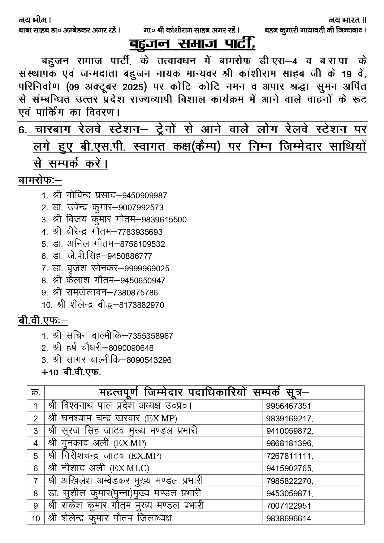 लखनऊ। 14 साल बाद बहुजन समाज पार्टी फिर से अपनी खोई राजनीतिक ताकत पाने के लिए बसपा संस्थापक मान्यवर कांशीराम जी के पुण्य तिथि (9 अक्टूबर 2025) के अवसर पर राजधानी लखनऊ के रमाबाई मैदान में एक विशाल रैली का आयोजन करने जा रही है। इस रैली में 403 विधान सभाओं में से लगभग 10 लाख से अधिक समर्थकों के जुटने की उम्मीद है। बहुजन समाज पार्टी और बसपा के चाणक्य इस रैली को सफल बनाने के लिए दिन-रात एक किए हुए हैं। बसपा सुप्रीमो मायावती की सक्रियता से विपक्षी दल इस रैली को लेकर निगाहें जमाए हुए हैं। राजनीतिक विश्लेषकों का कहना है कि अगर बसपा दमदारी से चुनावी मैदान में उतरती है तो सत्तारूढ़ पार्टी समेत अन्य दलों के लिए बड़ी चुनौती साबित होगी।