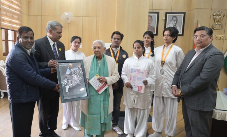 इस मौके पर पर अंतर्राष्ट्रीय कुंग फू फेडरेशन के ग्रैंडमास्टर ज्ञान प्रकाश त्रिपाठी, भारतीय टीम के प्रबंधक डा.राजेंद्र कुमार गौतम तथा भारतीय टीम के समन्वयक डॉ शिशुपाल सिंह ने राज्यपाल महोदया को हार्वर्ड विश्वविद्यालय के द्वारा ताइची पर लिखी गई एक पुस्तक तथा कुंग फू के जन्मदाता बोधिधर्म का तैल चित्र भेंट किया। इस अवसर पर बोलते हुए श्रीमती आनंदीबेन पटेल ने इस खेल को विभिन्न विद्यालयों एवं विश्वविद्यालयों में सिखाए जाने की आवश्यकता पर सहमति व्यक्ति की और कहा कि आज के परिपेक्ष में खेल समाज की सर्वाधिक आवश्यकता है। इसके बाद पूर्व आईएएस और प्रसार भारती के पूर्व अध्यक्ष डॉ नवनीत सहगल ने कुंग फू टीम को जीत की बधाई दी।