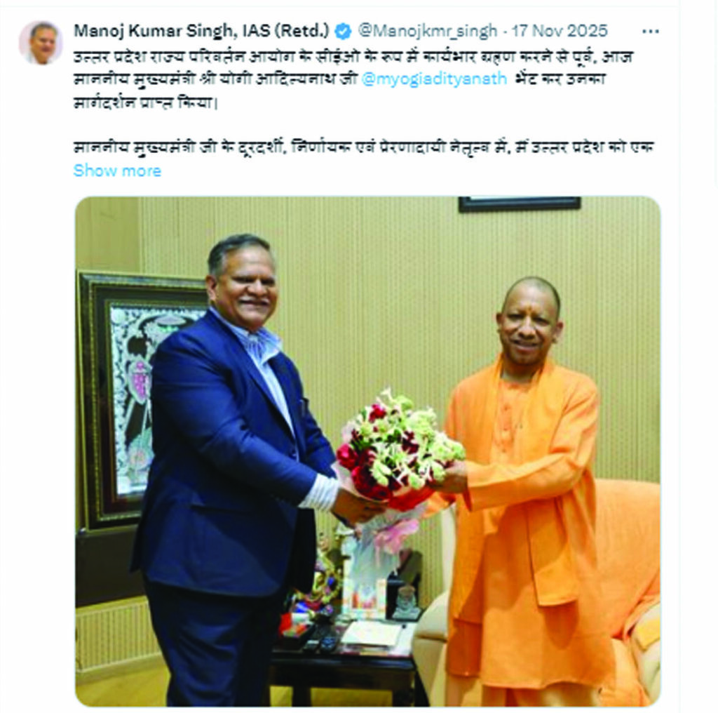 आपको बताते चलें कि 31 जुलाई 2025 को यूपी के मुख्य सचिव मनोज कुमार सिंह रिटायर हो गए थे। सेवा विस्तार के लिए जी-जान लगा दिया था। लेकिन सेवा विस्तार नहीं मिल पाया। इसके बाद तमाम प्रतिद्वंद्वी अफसरों को उम्मीद है कि अब मनोज कुमार सिंह की वापसी नहीं होगी। 16 नवम्बर 2025 को योगी सरकार ने पूर्व मुख्य सचिव मनोज कुमार सिंह को राज्य परिवर्तन आयोग का सीईओ तीन वर्ष के लिए नियुक्त कर दिया। 17 नवंबर 2025 को राज्य परिवर्तन आयोग के सीईओ का पदभार ग्रहण कर लिया।