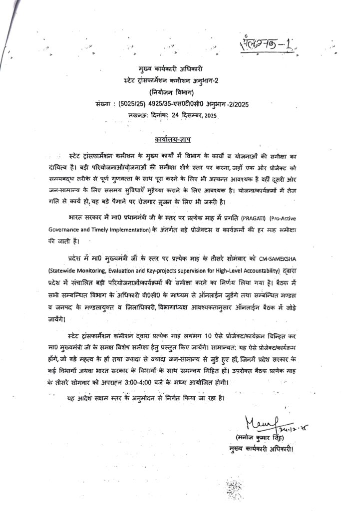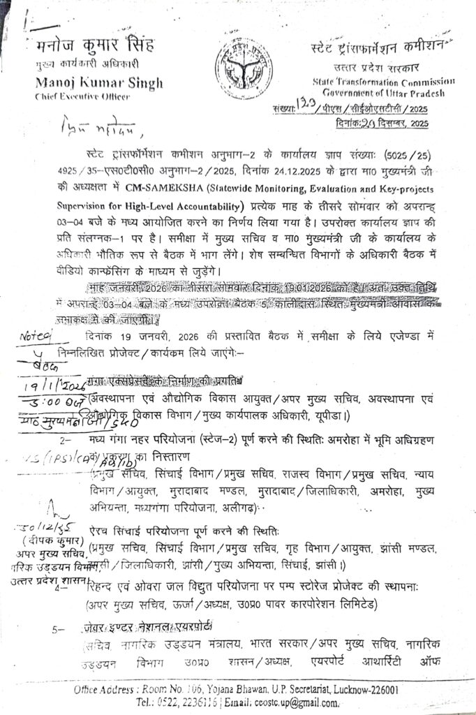 24 दिसंबर 2025 को राज्य परिवर्तन आयोग के सीईओ मनोज कुमार सिंह ने एक कार्यालय ज्ञाप जारी किया। जिसमें कहा गया कि राज्य परिर्वतन आयोग को मुख्य कार्यों में विभागों के कार्यों व योजनाओं की समीक्षा का दायित्व है। बड़े प्रोजेक्ट और योजनाओं को समयबद्घ पूरा कराना है। भारत सरकार में प्रधानमंत्री के स्तर पर प्रत्येक माह बड़े प्रोजेक्टों की प्रगति की समीक्षा होती है। ठीक उसी तरह प्रत्येक माह के तीसरे सोमवार को मुख्यमंत्री द्वारा सीएम समीक्षा की जाएगी। बैठक में सभी संबंधित विभागों के आला अधिकारी वीसी के माध्यम से जुड़ेंगे। इस संबंध में 29 दिसंबर को बैठक आहूत की गई थी। यह बैठक इसलिए सफल नहीं हो पाई थी दावोस में हो रही बिजनेस मीटिंग में मुख्य सचिव और आईआईडीसी समेत तमाम आला अफसर शामिल होने के लिए जाना था।